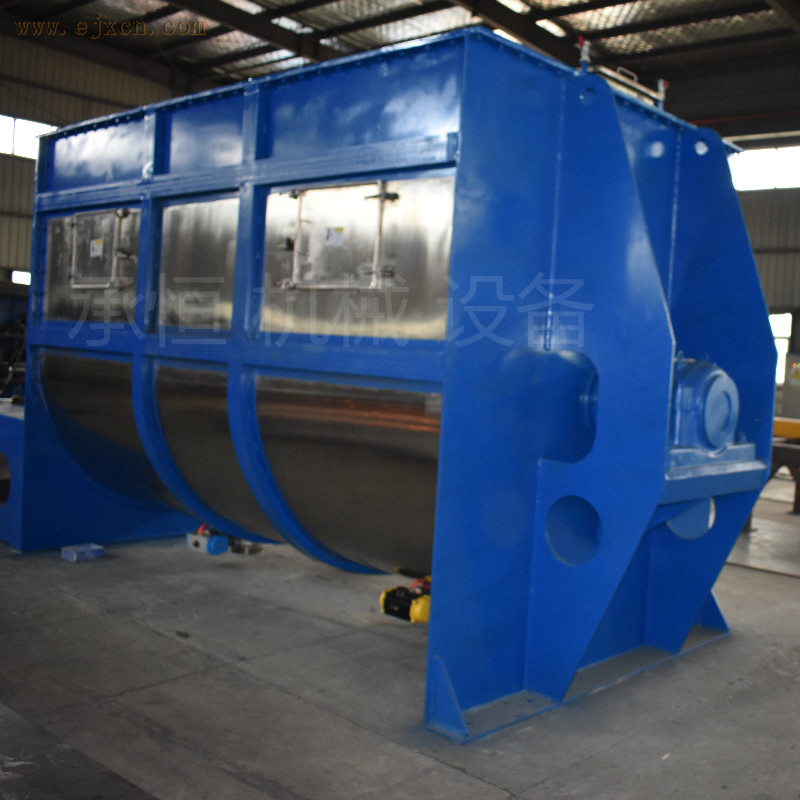 无重力混合机卧式筒体内装有双轴旋转反向的浆叶,浆叶成一定角度将物料沿轴向、径向循环翻搅 使物料迅速混合均匀:为降低设备易损件的更换成本 桨叶叶片可做成两片式 在叶片基座上热一块可移动小叶片可直接更换磨损的小叶片经济快捷:出料形式一股为气动(手动)翻板阀,圆弧阀门紧密嵌入筒内,与筒内壁齐平,无物料堆积和混合死角现象;标准型有大开门小开门之分,大开门开口到筒边 放料干净快捷 残留少。无重力混合机性能特点减速机带动轴的旋转速度与桨叶的结构会使物料重力减弱,随着重力的缺乏各物料存在颗粒大小,比重复殊的差异在混合过程中被忽略,激烈的搅拌运动缩短了一次混合的时间,更快速,即使物料有比重、粒径的差异,在交错布置的搅拌叶片快速剧烈的翻腾洒下也能达到很好的混合效果。