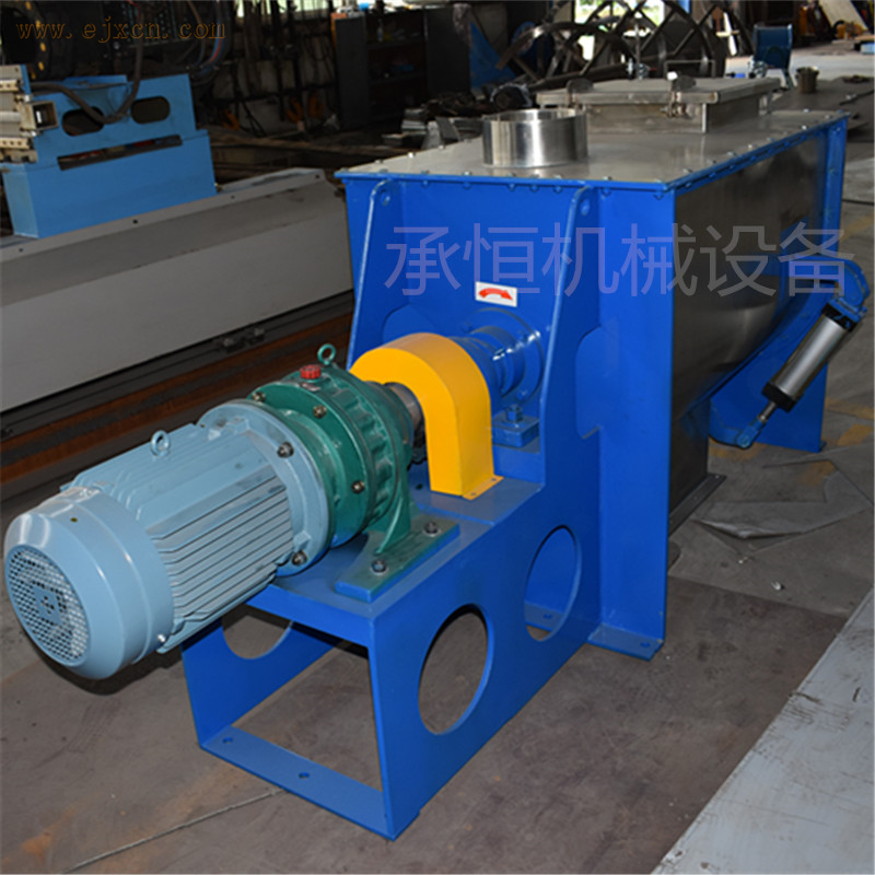 卧式筒体内装有双轴旋转反向的浆叶,浆叶成一定角度将物料沿轴向、径向循环翻搅,使物料迅速混合均匀卧式混合机性能特点减速机带动轴的旋转速度与桨叶的结构会使物料重力减弱,随着重力的缺乏,各物料存在颗粒大小、比重悬殊的差异在混合过程中被忽略。激烈的搅拌运动缩短了一次混合的时间,更快速 即使物料有比重、粒径的差异,在交错布置的搅拌叶片快速剧烈的翻腾抛洒下,也能达到很好的混合效果。混合均匀度高,残留量少。