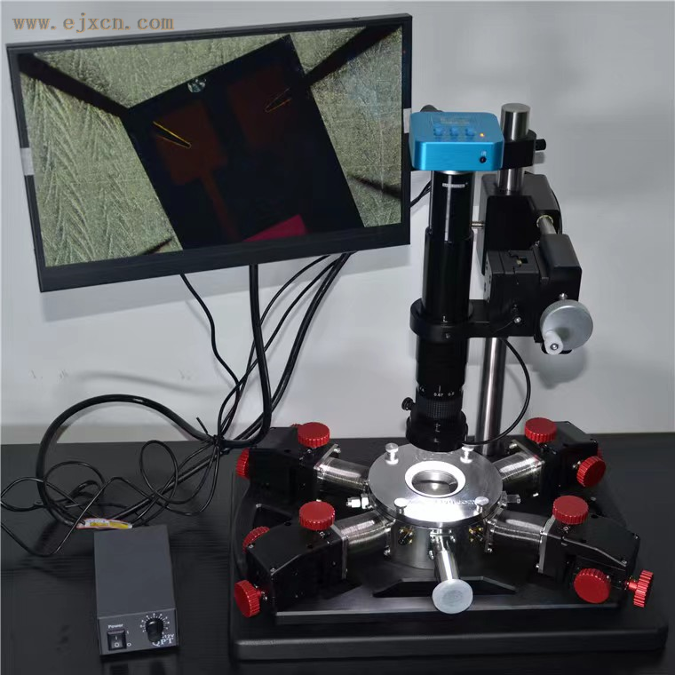 微型真空探针台的承片台X/Y/Z三个方向均可在真空环境下调节,其中X方向调节范围:0-30mm;y方向调节范围:0-13mm;z方向调节范围:0-13mm;用户可根据需要自行调节。使用时将需检测的器件固定在加热台上,再微调探针支架X/Y/Z 方向行程,通过显微镜观察,使探针对准检测点后,即可进行检测。
