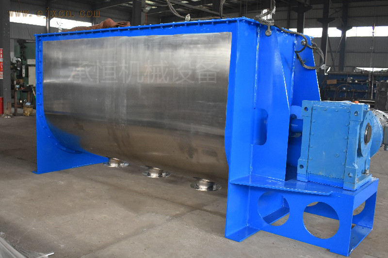工作原理:混合机的传动主轴上布置双层螺旋叶片,内螺旋将物料向外侧输送,外部螺旋将物料向内聚集。物料在双层螺旋带的对流运动下,形成一个低动力的混合环境。安装于搅拌轴上的内外径螺旋带动桶体内物料,使搅拌器在桶体内大范围翻动物料搅拌装置工作时内螺旋带动靠近轴心处物料做轴心旋转,轴向由内至两侧推动,外螺旋带动靠近桶壁物料做轴心旋转,轴向由两侧至内推动,本混合物料能够在较短时间内均匀混合。
