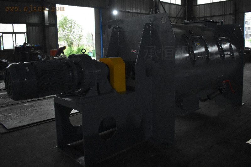 卧式螺带混合机以有效率、快速混合物料,在搅拌轴的螺旋带运动下使内外螺旋带在较大范围内翻动物料,内螺旋带将物料向内侧运动,外螺旋带将物料由两侧内向运动,使物料来回掺混,另部分物料被螺旋带推动下,沿轴向径向运动,从而形成对流循环。由于上述运动的搅拌,物料在较短时间内获得快速均匀混合。