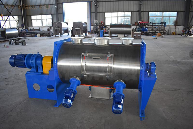 该产品对动力的要求较小,混合混合匀度高,出料方便,能够将设备容积制作成大型设备,相对混合时间较长,所以一般应用在大批次混合时使用,例如方便面调料调味包、染料调色等情况下使用