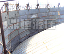 9)当整个气柜柜顶系统上升到指定的安装位置时,可以进行柜顶的安装工作,柜顶安装完毕可将挂钩装置与柜顶脱离,使挂钩装置随同活塞系统整体回落。