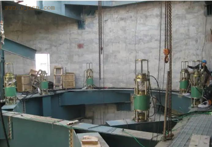 在储罐基础及储罐底板施工验收完毕,且完成罐顶及顶部单层壁板的安装后,利用均布在储罐内侧的提升架,在上部安装上,下限位的单向卡头,其中上卡头带有液压油缸,动力来自中央控制台,高压油经软管送至双作用油缸(上卡头),通过换向阀实现油缸的往复动作。活塞杆为空心,中间穿有钢制提升杆。