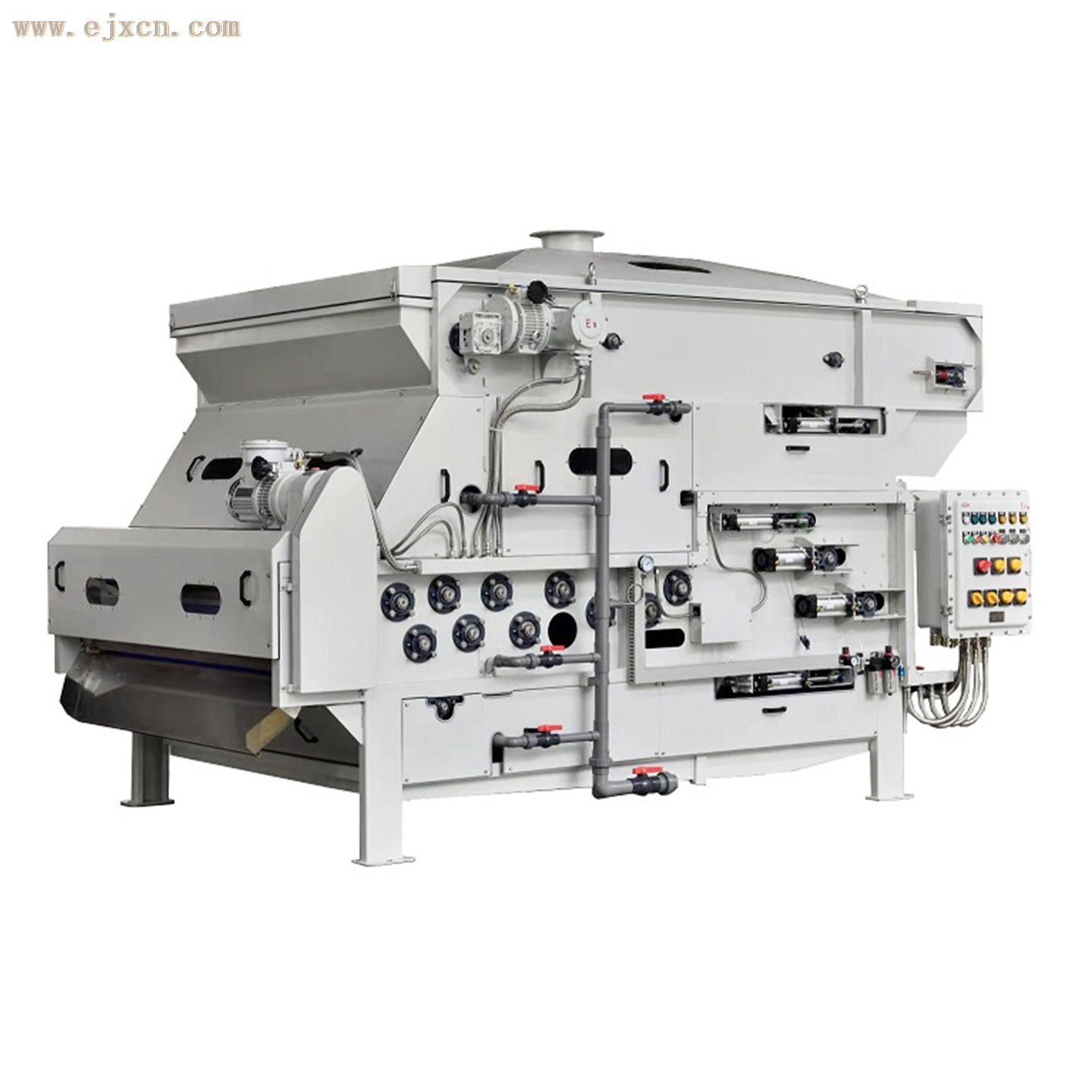 海巴机械带式污泥浓缩脱水一体机由调理搅拌系统,滤带重力浓缩系统,去除大部分的自由水,压榨脱水系统和自控系统组成,污泥与絮凝剂在调理槽内充分混合,形成絮团,经过重力浓缩系统对污泥预浓缩,去除大部分的自由水之后的污泥经过契型脱水区进行预压脱水,然后逐步提高压榨力,脱水后的污泥含水率一般在80%左右。