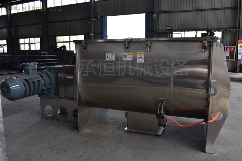 卧式螺带混合机以有效率、快速混合物料,在搅拌轴的螺旋带运动下使内外螺旋带在较大范围内翻动物料,内螺旋带将物料向内侧运动,外螺旋带将物料由两侧内向运动,使物料来回掺混,另部分物料被螺旋带推动下,沿轴向径向运动,从而形成对流循环。由于上述运动的搅拌,物料在较短时间内获得快速均匀混合。