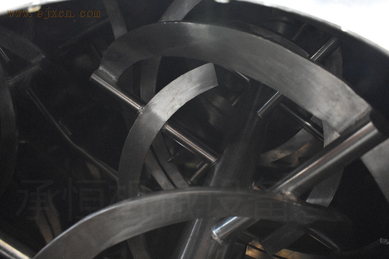 3、正反旋转螺条安装于同一水平轴上,形成一个低动力有效率的混合环境,螺带状叶片一般做成双层或三层,外层螺旋将物料从两侧向汇集,内层螺旋将物料从向两侧输送,可使物料在流动中形成更多的涡流。加快了混合速度,提高混合均匀度
