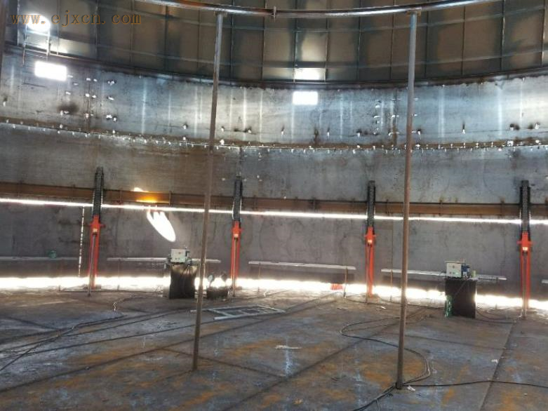 ④安装筒体内侧、外侧环形悬吊组对、焊接操作平台。内侧环形焊接操作平台安装在地面的轨道平板小车上;外侧环形悬吊组对、焊接操作平台由2个半圆环形操作平台通过法兰螺栓连接而成整体,由烟囱35m层平台钢梁上悬挂的6个1.5t手扳葫芦牵拉悬挂,可沿钢内筒外壁上下自由升降。