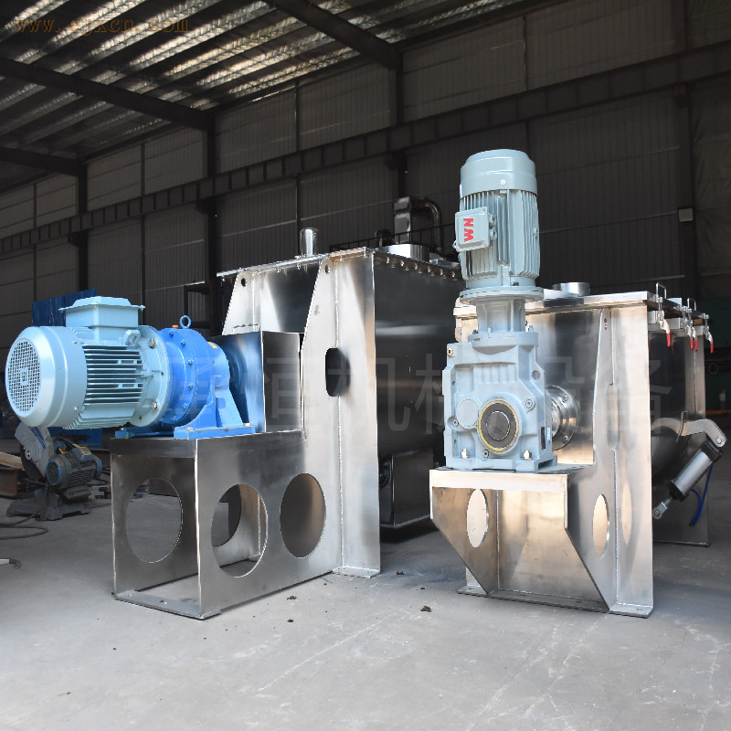 卧式螺带混合机以有效率、快速混合物料,在搅拌轴的螺旋带运动下使内外螺旋带在较大范围内翻动物料,内螺旋带将物料向内侧运动,外螺旋带将物料由两侧内向运动,使物料来回掺混,另部分物料被螺旋带推动下,沿轴向径向运动,从而形成对流循环。由于上述运动的搅拌,物料在较短时间内获得快速均匀混合。