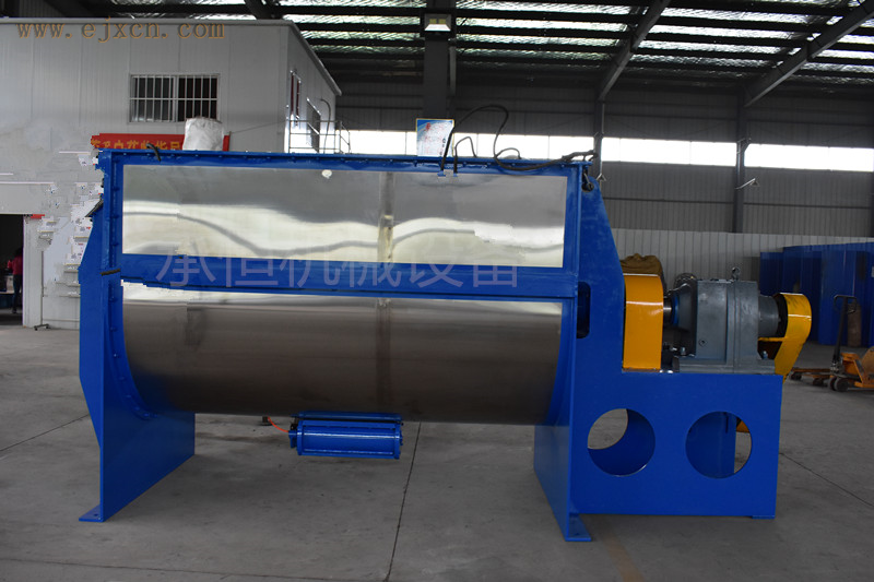 工作原理:卧式双螺带混合机U型筒体内安装双层螺带盘绕的搅拌器轴,外螺带在动力的驱动下把物料从U型仓两端向推动,而内螺带把物料从中间向两端推动,形成对流混合。筒体底部开设出料口,外层螺带驱赶筒壁内侧物料至出料口出料,确保出料无死角