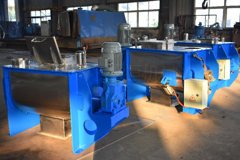 螺带式混合机是一种常用的混合设备,主要由U型筒体、螺带搅拌器、动力装置和密封装置组成。U型筒体可以根据客户要求做成不锈钢、碳钢或镀层材质,端板则一般用碳钢制成并覆盖一层不锈钢以避免污染物料。螺带搅拌器配置了双层螺带,两层螺带方向不同,同时搅拌会使物料在筒体内形成对流循环,从而达到快速混合物料的目的。卧式螺带混合机的动力装置是电机和减速机,通过十字滑块联轴器链接,小型的卧式螺带混合机电机和减速机之间是直接链接,而1000L以上的卧式螺带混合机则使用皮带轮链接。卧式螺带混合机的密封装置采用填料密封,在搅拌器的轴头上有填料密封。