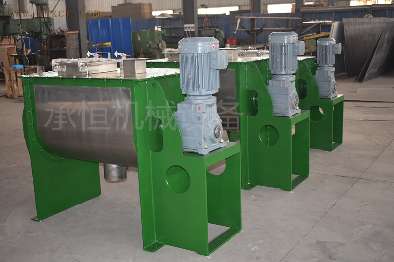 卧式螺带混合机以有效率、快速混合物料,在搅拌轴的螺旋带运动下使内外螺旋带在较大范围内翻动物料,内螺旋带将物料向内侧运动,外螺旋带将物料由两侧内向运动,使物料来回掺混,另部分物料被螺旋带推动下,沿轴向径向运动,从而形成对流循环。由于上述运动的搅拌,物料在较短时间内获得快速均匀混合。