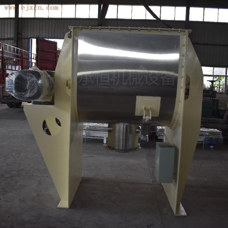 本机搅拌器由搅拌主轴和两根与筒体内壁表面吻合的螺带及螺旋叶片组成。旋转时,螺带和螺旋叶片将物料由下向上沿筒体内壁盘旋提升,同时又由于运转时螺带带面上的各点线速度不同,物料在其作用下产生了不规则的对流、剪切、掺混、扩散,形成各方位的三维运动。搅拌轴中间位置是螺旋叶片,运转时将靠中间位置的物料提升、抛出,被抛出的物料一部份进入螺带,而被螺带抛出的物料又被吸收到螺旋叶片的螺旋包络体内而提升。如此不断反复循环,使物料在短时间内达到均匀混合。