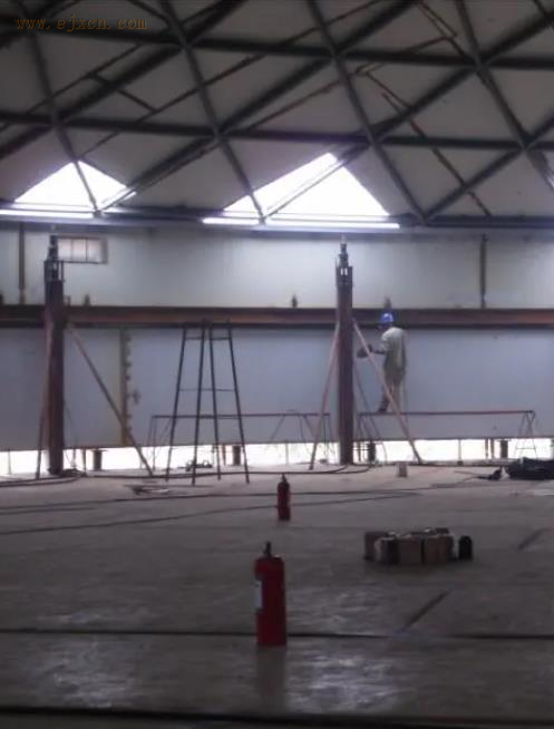 液压提升设备提升原理利用液压提升装置均布于储罐内壁圆周处,先提升罐顶及罐体的上层壁板,然后逐层组焊罐体的壁板。采用自锁式液压千斤顶和提升架、提升杆组成的液压提升机,当液压千斤顶进油时,通过其上卡头卡紧并举起提升杆和胀圈,从而带动罐体向上提升;当千斤顶回油时,其上卡头随活塞杆回程,此时其下卡头自动卡紧提升杆不会下滑,千斤顶如此反复运动使提升杆带着罐体不断上升,直到预定的高度。当下一层壁板对接组焊后,打开液压千斤顶的上、下松卡装置,松开上下卡头将提升杆以及胀圈下降到下一层壁板下部胀紧、焊好传力筋板,再进行提升。如此反复,使已组焊好的罐体上升,直到 后一层壁板组焊完成,从而将整个储罐安装完毕。