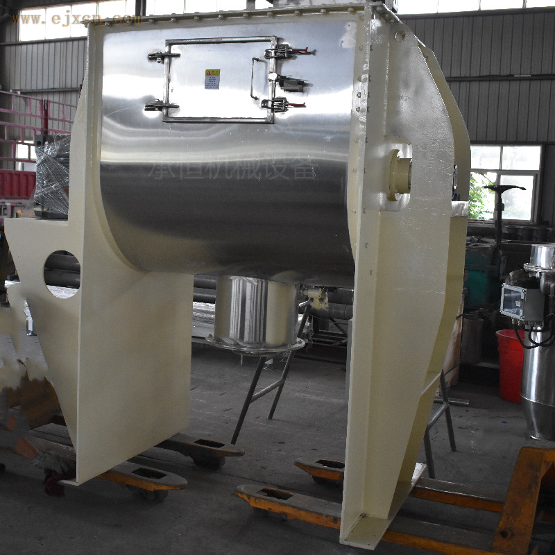 本机通过机械传动,使S式搅拌桨旋转,推动物料往复翻动,均匀混合,操作采用电气控制,可设定混合时间,到时自动停机,电动倒料,从而提高每批物料的混合质量,达到高均匀度的混合