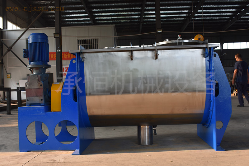 混合机筒内的两只非对称螺旋的快速自转将物料向上提升,形成两股非对称沿筒壁自下向上的螺柱形物料流,转臂带动的螺旋公转运动,使螺旋外的物料不同程度进入螺柱包络线内,一部分物料被错位提升,另一部分物料被抛出螺柱,从而达到合圆周方位物料的不断更新扩散,被提到上部的两股物料再向中心凹穴汇合,形成一股向下的物料流,补兖了底部的空穴,从而形成对流循环。由于上述运动的复合,物料在短时间内获得了均匀混合,混合度较高。