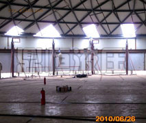 液压顶升主要由以下设备和构件组成:YB-90型液压泵站(1台);SQD-150-1200型液压千斤顶(8台);8根提升钢爬杆(φ75mmx9m配双螺母);自制钢支撑(或钢立柱)8个;自制外部环形抱箍(1个);自制外部环形单轨吊(1个),另有液压同步阀、高压油管若干。