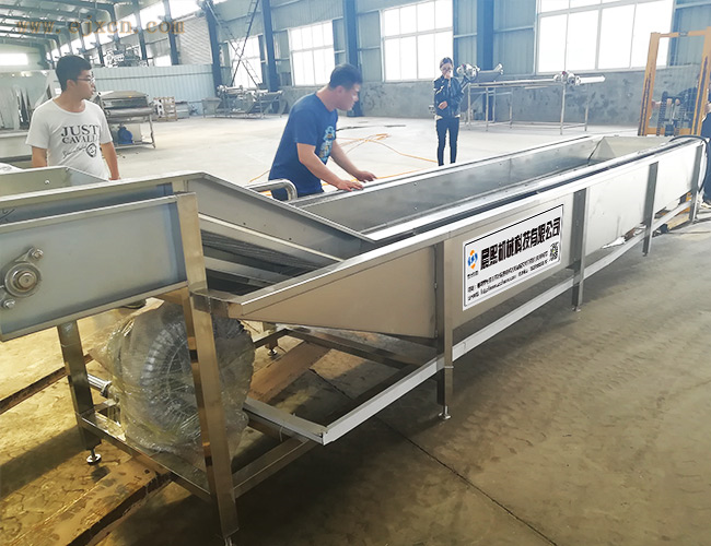 加工清洗莴苣首先要用到气泡清洗机将莴苣放入气泡清洗机中利用水浴式清洗模式进行清洗通过气泡的翻滚将表面的大量泥沙冲洗干净机内装有水过滤循环装备,污水泥土从排污口排出绝不影响池中水二次感染,由输送带挡板拖动莴苣进入高压喷淋平行毛辊机中下方由毛辊进行不伤害表皮的清洗于上方高压喷淋配合更加有效的将表面泥土与杂质冲洗干净,清洗后的莴苣进入震动风干沥水机内进行快速地将表面水分吹干每台的电机交叉安装,网带呈翻转式更好的将每一面都风干到位,风干好的莴苣可直接装箱入库,或是配送食堂净菜加工等,本机采用304不锈钢材质操作简单运行平稳,晨熙机械自主研发净菜加工清洗10余年,在技术上有着独特见解与高超的技术制作含量,有想咨询的老板们可后台联系我们。我们将为您提供优质的服务免费提供技术指导,用我们诸城晨熙机械净菜加工设备保证让您得到满意的效果,省时,省力,省人工,产品效率快,节约成本,清洁力度大是您最佳的选择。