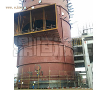 钢内筒的高度一般都高出烟囱混凝土外筒,故钢内筒的提升施工换一次吊点在鹤壁电厂三期工程钢内筒施工中,烟囱外筒壁高235m;钢内筒高240m;烟囱内壁每隔30~40m布置一个钢结构检修工作平台,吊装平台设置在烟筒220m标高处,液压顶升装置其施工方案如下:①在烟囱内Om处组装焊接平台,先加工焊接钢内筒顶部不锈钢烟道口,完成后,加工焊接第1吊装段,连接下锚头并穿钢索后提升至超过下一基本节高度时停止提升,在吊装段下方焊接基本节,对中、找正、放下上段筒体,对口、焊接后再次提升,周而复始②钢内筒施工至其长度为50m时,焊接第2吊装段,然后继续提升组装钢内筒③钢内筒施工至其高度为80m时,将下锚头从第1吊装段移至第2吊装段为了避免第1吊点与吊装平台干涉,换完吊点后,割去第1吊点此时吊点上方筒体长50m;下方筒体长30m;继续提升④提升组装钢内筒至全长240界拆除设备,施工结束。