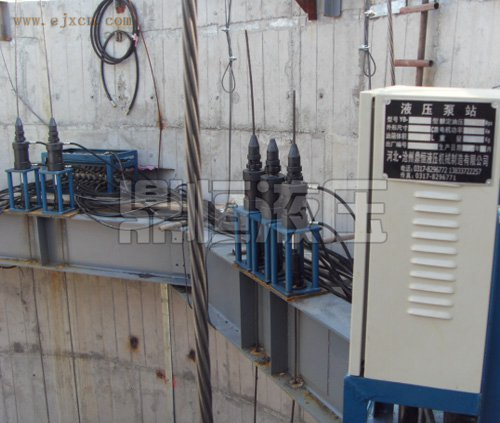 液压提升装置以集群千斤顶为执行机构,液压泵站为动力设备,以钢绞线悬挂承重,利用千斤顶上、下夹持器(自动工具锚)交替动作和千斤顶活塞与油缸沿钢绞线的相对运动,使重物上升(连续平移)或适量下降。此原理是将预应力锚具锚固技术与液压千斤顶技术进行的有机融合,通过锚具锚固钢绞线,再利用计算机集中控制液压泵站输出的流量和油压(比例阀、换向阀等驱动装置),驱动提升千斤顶活塞伸、缩(位移传感器装置),带动钢绞线与构件升、降、连续平移,实现大型构件的整体同步提升(平移)与适量下降,系统具有很强的施工现场适应性和可靠性。
