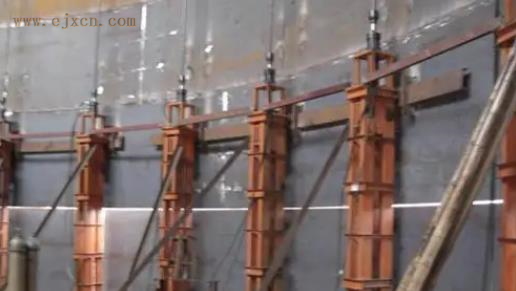 提升支架应均匀布置在槽壁内侧,尽量靠近壁板,以减少支架的弯矩。中央控制台置于槽中心,由高压橡胶软管连接各油缸的上下抽孔。支架的稳定性影响整个槽体提升的稳定,平稳垂直固定,并用两根斜支承和一根连到中心的径向水平拉杆支撑,使所有支架呈辐形连接。这种布置方式即可使单个支架有足够的刚度,又使所有支架形成封闭系统,充分保证提升系统的稳定性。使用时逐个进行空载试验,检查抽缸往复动作,提升杆步进,上、下卡头是否可靠,提升杆与滑板的运动,以及中央控制台和抽管是否正常工作。