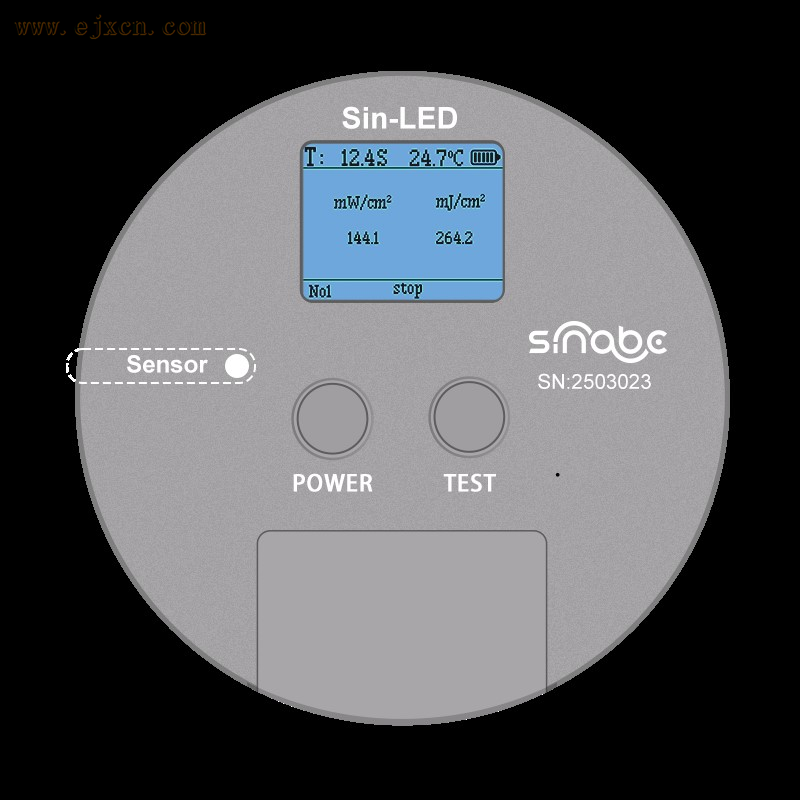 Sin-LED 是一款受光强在仪器背面,同时测试UV能量和UV光强、温度一体的UV能量计。能量是一个积分总值单位,因此多用于有传送带、或者有计时装置的曝光设备上。