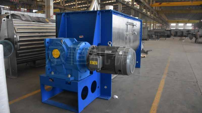 1.卧式螺带搅拌机由搅拌仓、搅拌器、驱动装置基本组成,U型管状仓内安装双层异向螺带盘绕的搅拌器轴,外螺旋带在动力的驱动下,其盘绕形式配合旋转方向把物料从U型仓两端推动,而内螺旋带把物料从中间向两端推动,形成对流搅拌。