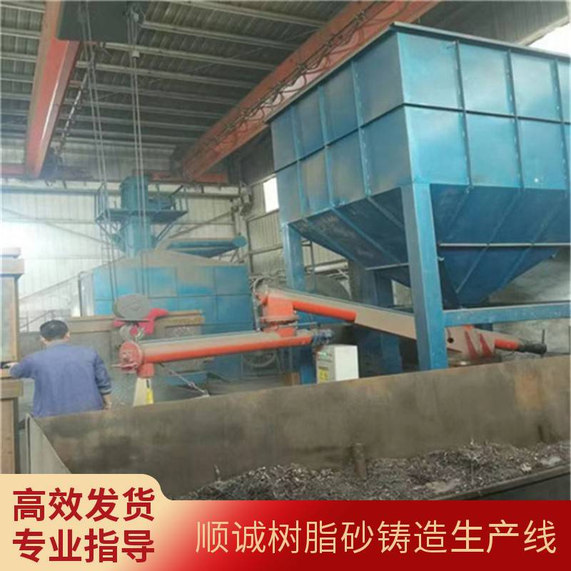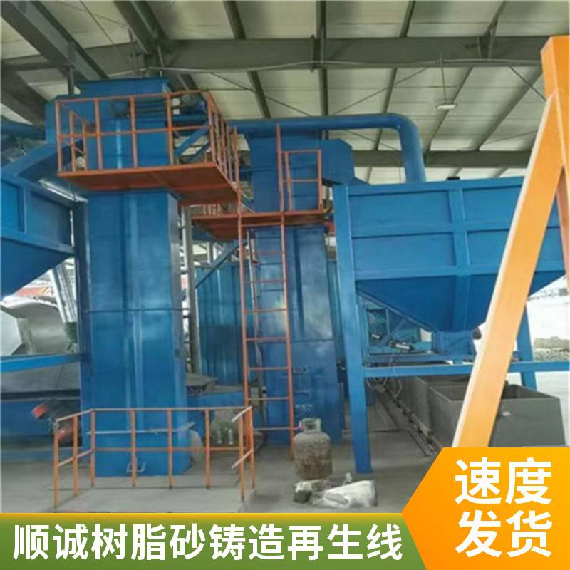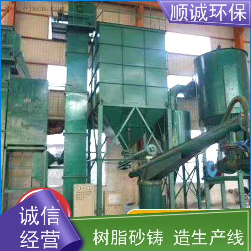 树脂砂生产线工艺流程:浇注后的砂箱及铸件由行车吊至惯性振动落砂机上,经落砂处理后,铸件运到清铲车间,砂箱运至砂箱库备用。大块夹皮,冒口由人工分拣,通过落砂栅格的砂子、砂团以及小块冷铁落至磁选皮带机,经磁选后输送至多功能振动破碎再生机进行破碎、脱膜、筛分,经过筛分后的砂子进斗式提升机,由提升机提升至离心转子二级再生机进行***再生,充分脱膜。混合着微粉、灰尘、树脂膜的再生砂经流砂槽流入流幕式风选机,风选机连接着旋风除尘器及脉冲式反吹除尘器,将微粉、灰尘去除。再生砂再经斗式提升机提升至砂库备用。移动双臂式连续树脂砂混砂机上方进料口由气动闸板与砂库下方出砂口相连,按下混砂机电控箱混砂按扭后,气动闸板自动打开,定好量的砂子由砂库流入混砂机。在混砂机中砂子经螺旋片向前输送至混砂开始端,自近端控制阀加入固化剂,经小叶片搅拢预混至后面的近端阀加入树脂,进入混砂端。固化剂、树脂、再生砂充分混匀后送至前端出料口自动流入准备好的砂箱内用于造型、制芯。此设备由PLC(编程可控)控制自动化性能优良,适用于树脂砂工艺的中小铸造企业。