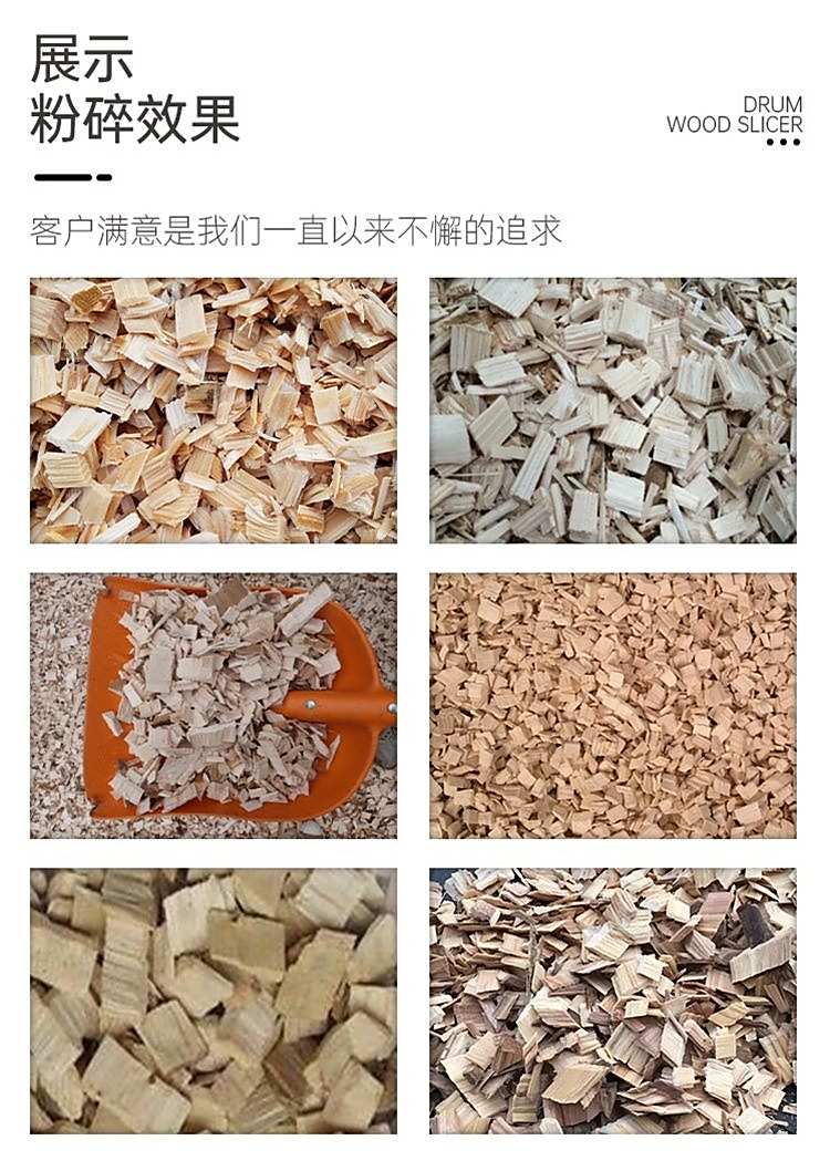 木料由进料口送入,当木料按接触到削切刀片时,跟着削切刀盘的高速旋转进行削切,其切削机构是一个旋转的鼓轮,上面安装若干把飞刀,飞刀旋转时将木材加工成木片。鼓轮外缘上有多个方形通孔,切削下来的合格片料通过网筛孔落下,有底部排出,大的料片将在机内再次切削。