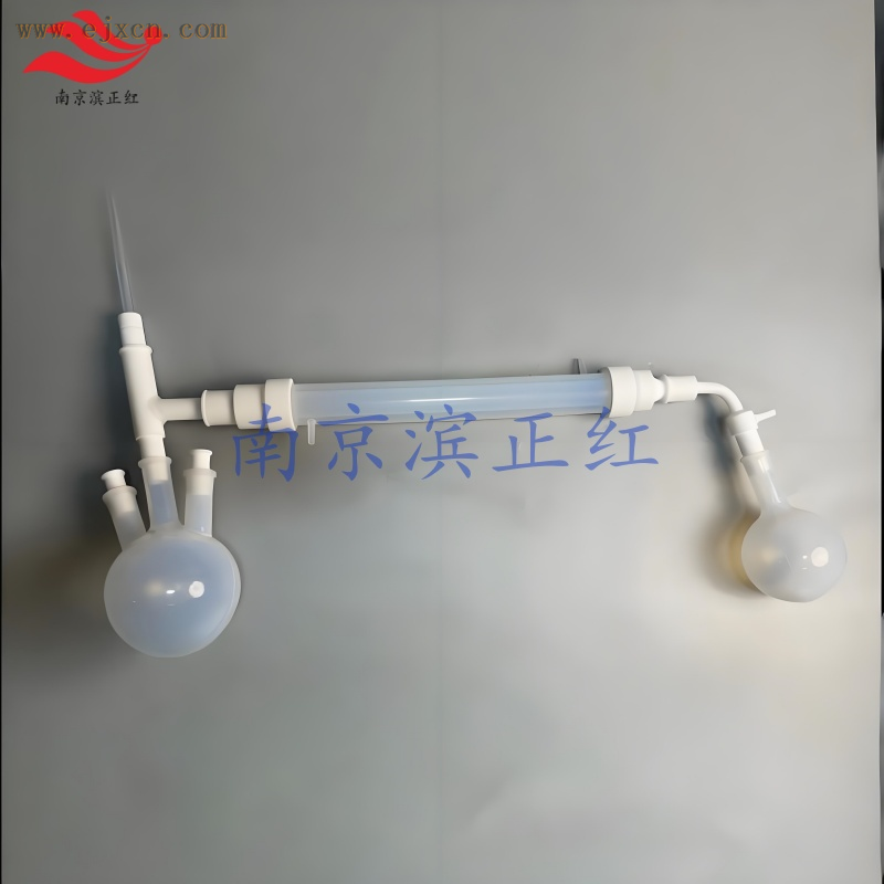 PFA蒸馏冷凝装置通常由加热、冷凝、收集三部分组成:加热部分用于加热含有待分离混合物的蒸馏瓶;冷凝部分利用特氟龙材料优异的化学稳定性、耐高温性和耐腐蚀性(不与HF发生反应),将蒸气冷凝为液态;收集部分主要由PFA洗气瓶或PFA烧瓶组成,用于尾气吸收或二次反应收集。