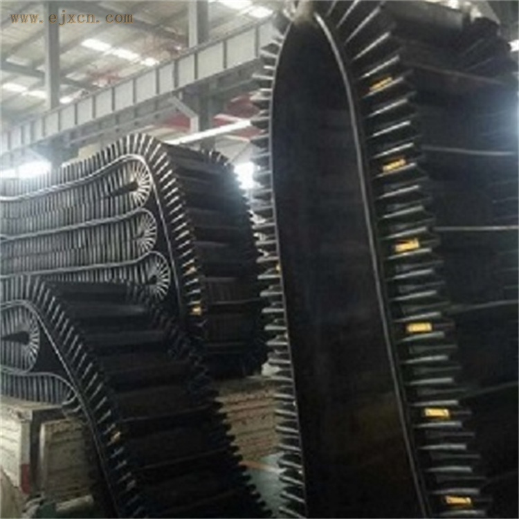 炜泰大倾角裙边带由基带、挡边、横隔板三部分组成。挡边起防止物料测滑撒落的作用。橡胶皮带当中大倾角挡边带是橡胶输送带当中技术含量非常高的一种特殊产品,而它的隔板部分对于硬度、磨耗、挺性等指标要求非常高大倾角挡边带隔板,其具有高硬度、耐磨、表面光滑不粘物料,使用寿命长的优点。挡边输送带可沿水平、倾斜、垂直和变角方向输送各种散装物料,无论是煤、矿石、沙子还是化肥和粮食等。400mm粒度以下粒度不限,输送量可从1m 3 /小时至6000m3/小时任选。基带的要求:挡边输送带基带要求具有一定的抗拉强度和耐磨性。其中对留有空边的挡边输送带,为了适应角度该向的要求,胶带的纵向要有柔软性,横向则要求一定的刚性。公司生产的挡边输送带采用特殊结构的横向刚性基带,解决了大规格输送带在回程过程塌带现象。基带的构造:基带是由上覆盖胶、下覆盖胶、带芯和横向刚性层四部分组成。上覆盖胶厚度一般为3-6mm;下覆盖胶厚度一般为1.5-4.5mm,带芯材料承受拉力,其材料可以是棉帆布(CC)、尼龙帆布(NN)、聚酯帆布(EP)或刚绳芯(ST)。为了增加基带的横行刚性,在芯体上、上假如特殊加强层,称横向刚性层。基带的宽度规格,与普通胶带相同波形挡边输送带被广泛引用与港口、冶金、矿山、电力、煤炭、铸造、建材、粮食