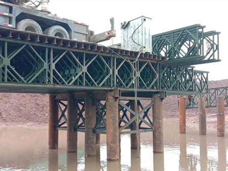 端应急场景(如地震后的废墟通道、陡峭山地救援)中,地形条件恶劣(坡度≥15°、地表障碍物多),需选用轻量化的铝合金折叠钢便桥(材质为铝合金)。其自重较守旧钢材减轻 40%-60%,单模块重量≤500kg,可通过人力搬运至复杂场地,跨度控制在 3-8m,承载能力 3-5t,采用卡扣式连接,拼接速率提升 50% 以上。这类钢便桥的基础要求低,可直接铺设在平整后的废墟或山地表面,通过不滑垫片固定,避免滑动,能在短时间内为救援人员与轻型设备提供通行确定。