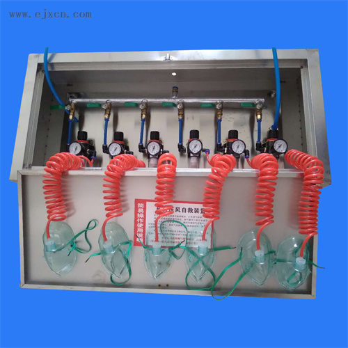 ZYJ-A型矿井压风自救装置,内装六个联成一组,装在不锈钢的箱体内,组成一个井下自救系统,并由地面泵房供气。(瓦斯突出矿井安装多少个组,视其井巷规模,井下工作人员编制的多少而定,一般情况下,井下安呼吸器的个数不得少于井下全员的三分之一)。