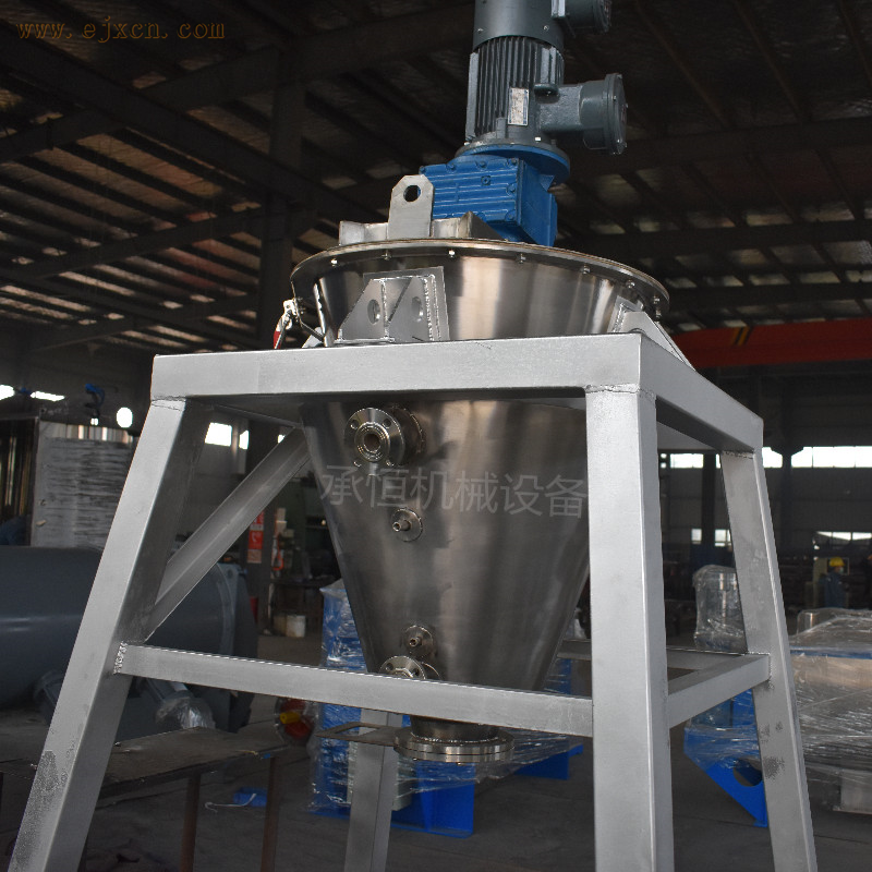 立式锥形螺带混合机适用范围广泛,适合粉体、颗粒物料、片状、液体、浆料、糊剂或者粘稠体物料的混合。设备由传动部分、立式螺条、倒锥形桶体组成,工作时螺带带动四周物料向上提升,物料在重力的作用下往下坠落,就这样循环提升降落重复工作,从而达到均匀混合的目的,混合均匀度高。一般应用于大批次混合,混合时间相对较长,功率相对比较低。目前该产品已经在食品、医药、化工、化妆品、橡胶、饲料、肥料、添加剂、精细化工、冶金、矿产、陶瓷、电子电池等领域得到广泛应用。