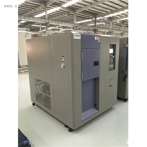 从结构上看,设备通常分为高温舱、低温舱、试验舱三个核心腔体,部分高端机型会增设预热 / 预冷缓冲舱,搭配气动平移门或提升机构实现试样的快速转移。工作时,高温舱通过电加热器(如不锈钢翅片式加热器)产生热量,配合强制对流风机使舱内温度稳定在设定高温区间(通常为 + 60℃~+200℃);低温舱则依靠制冷系统运作,采用蒸汽压缩式制冷循环,通过压缩机压缩制冷剂(如 R404A、R507),经冷凝器散热、节流阀降压后,在蒸发器内吸收热量,使低温舱温度降至设定低温值(常见为 - 40℃~-80℃),同时利用蒸发器翅片和循环风机保证舱内温度均匀。