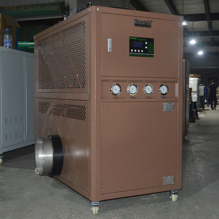 根据制冷系统原理:低温低压的液态冷媒在蒸发器与流入蒸发器里的空气进行热交换,蒸发器吸收空气中的热量,蒸发过程中冷媒温度不变,液态冷媒蒸发为低温低压气态的冷媒进入到压缩机,经压缩机压缩,被压缩成高温高压的气态,然后进入冷凝器,在冷凝器里与散热风机抽放的自然风进行热交换,将高温高压的冷媒的热量排出机外,冷变流出冷凝器经过干燥过滤器,将蒸发过程中冷媒所含的水分或其它杂质过滤,然后进入膨胀阀节流,膨胀节流是迅速降温的过程,冷媒变成低温低压的液态,此过程后的冷媒再进入到蒸发器进行换热蒸发,从而实现制冷系统的整个过程,这种循环是连续进行的,水才得以连续不断的制冷,再通过风机把冷气从头风口送入所需要降温的目的地。
