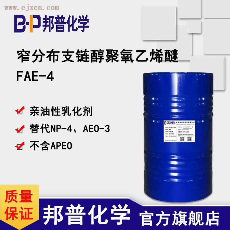 FAE-4窄分布支链醇聚氧乙烯4醚,非离子表面活性剂。不含APEO,用于替代NP-4、AEO-3、异构醇醚等,易溶于油和有机溶剂,水中呈分散状,具有良好的乳化性能;FAE-4为亲油性非离子型乳化剂,用于制备W/O型乳液,主要用作乳化剂、匀染剂、净洗剂等。