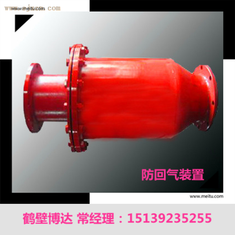 三、安装:防回水防回气装置按照气体流向,在吸气管路中,安装在排渣器后面,防回火装置前面,在排气管路中,该装置安装在三防装置的末位,是后一道三防装置。安装防回水防回气装置时切记止回挡板一定要竖直向下,使其在无外力作用下能够依靠自重将管口紧密盖住,排水阀门应该在装置的下方,如果条件允许,在排水阀门下接一个排水管路,将排出的水引入排水池中。